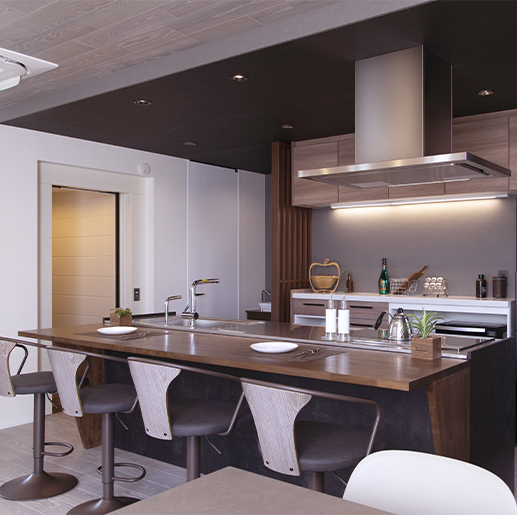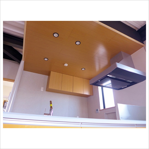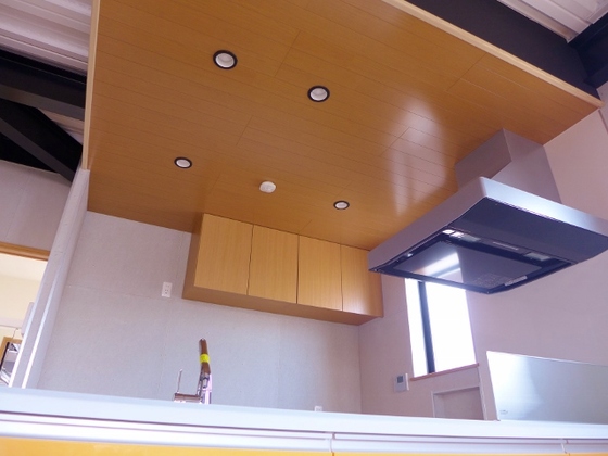 キッチンの天井。木目デザインで温もりを演出