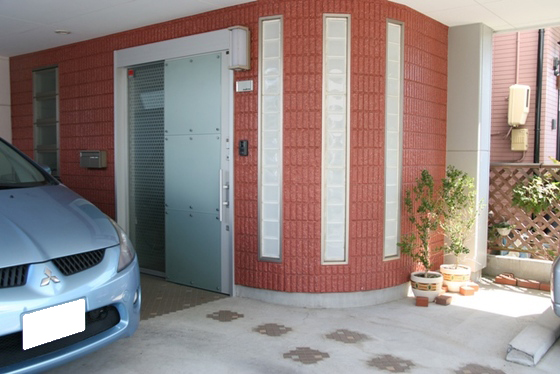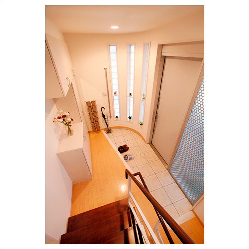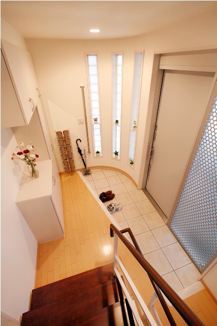 3本のガラスブロック埋込みが玄関ホールを際立たせる