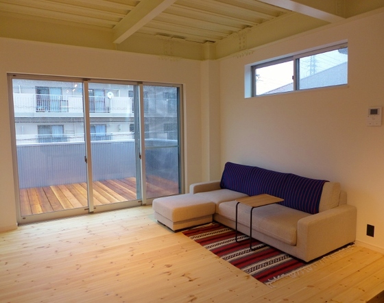 リビング横のウッドデッキ。天井の鉄骨と木のコントラスト