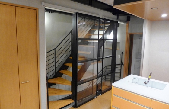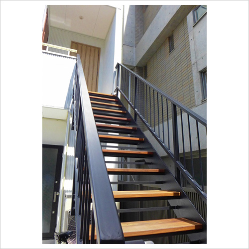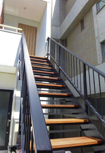 ブラックの鉄骨に木の踏み板をセット。冷暖房が逃げない階段室