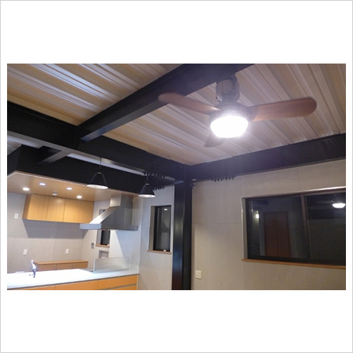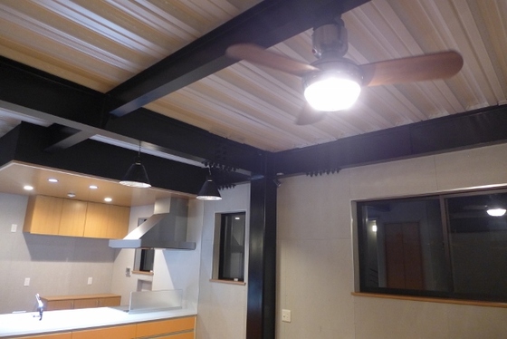 鉄骨剥き出しの天井。スタジオ風のシーリングファン