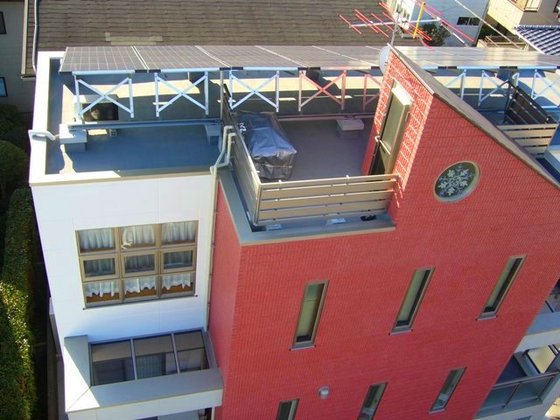 屋上にソーラーパネル。露天風呂用に浴槽準備